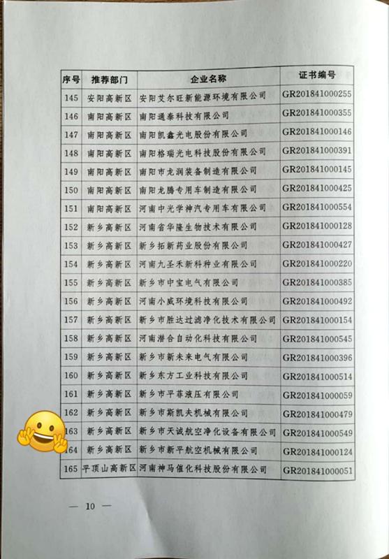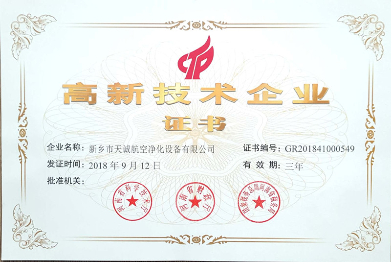 2018年12月,新鄉(xiāng)市天誠航空凈化設(shè)備有限公司獲高新技術(shù)企業(yè)認(rèn)定,認(rèn)定的通過,對公司業(yè)績將有積極影響,顯示了天誠公司自主研發(fā)、創(chuàng)新能力等方面的實(shí)力,也是國家主管部門對公司科技創(chuàng)新成果的肯定。
